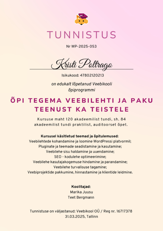 Kursuse maht 120 akadeemilist tundi, s.h 84 akadeemilist tundi praktilist, auditoorset õpet. Selle käigus tegin endale kodulehe ja leidsin juba ka esimesed kliendid.