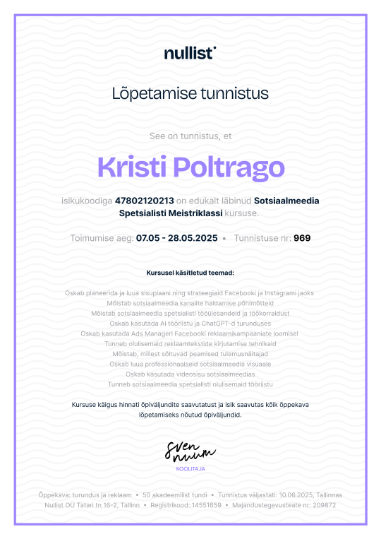- Oskan luua professionaalseid sotsiaalmeedia visuaale ja kasutada videosisu sotsiaalmeedias